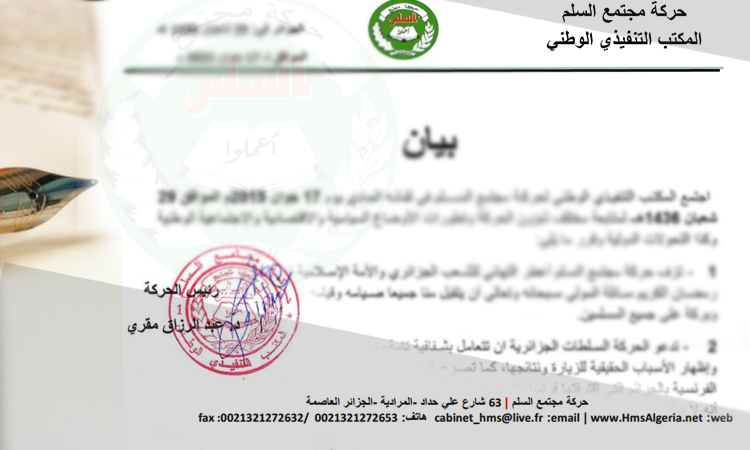 حركة مجتمع السلم تدعو لحماية الحراك، ضمان حرية الرأي، دعم الحوار الوطني، التحذير من هشاشة الاقتصاد، وتأكيد دعم القضية الفلسطينية.